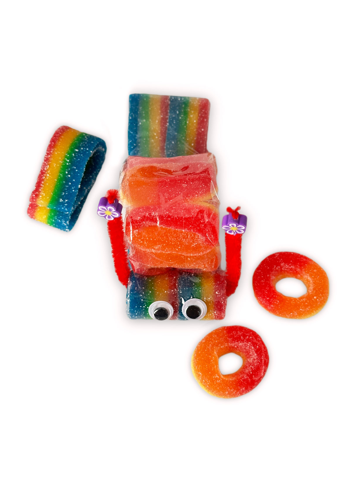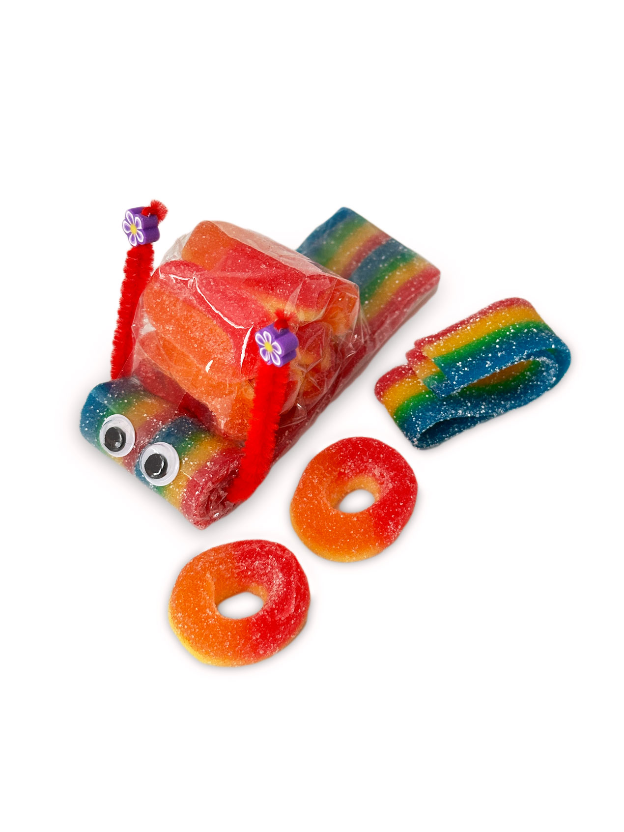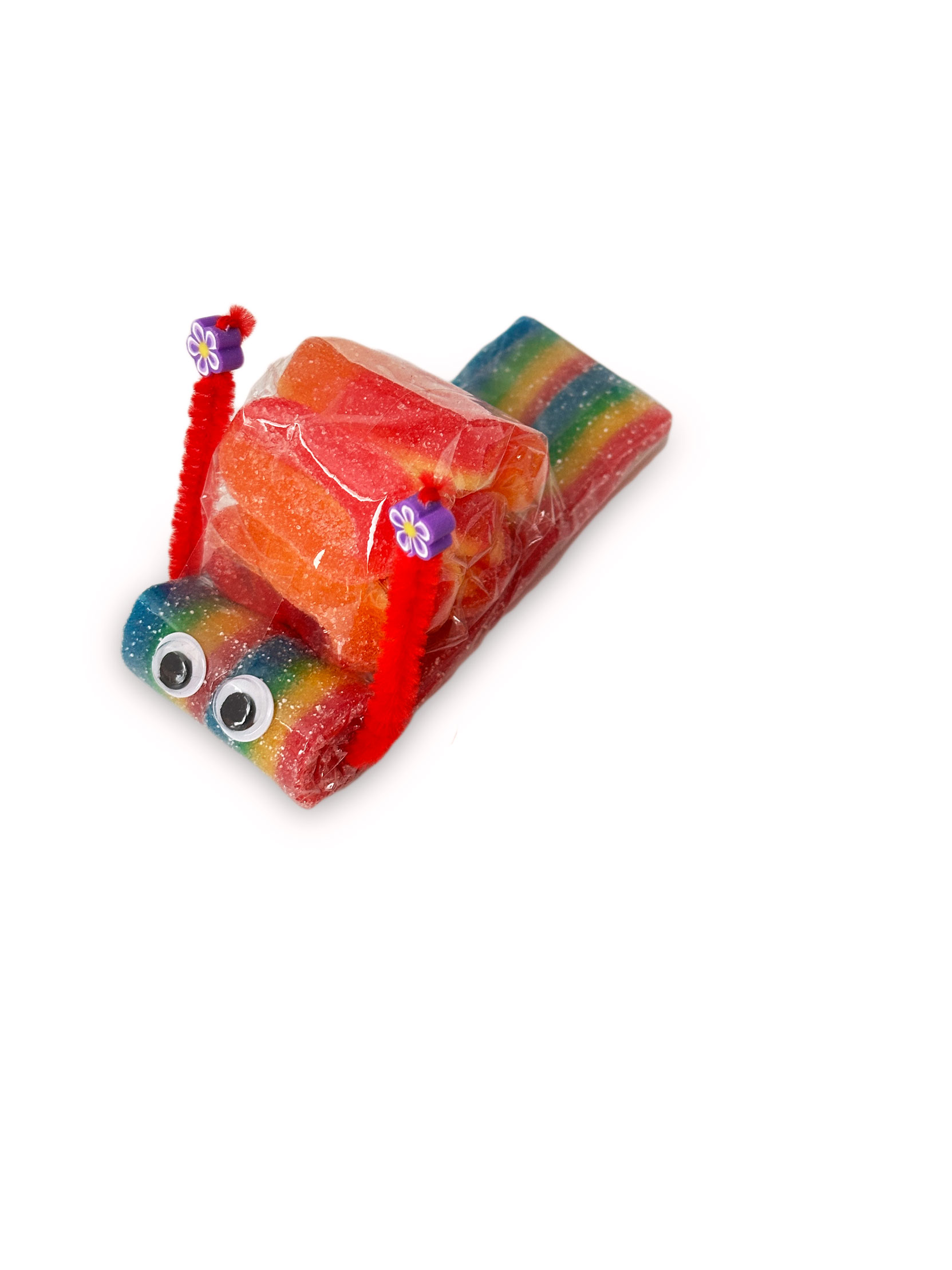 Sind sie nicht süß? Diese behutsam von Hand gefertigten Schnecken aus sauren Regenbogenbändern und Fruchtgummi-Pfirsichringen will man am liebsten gar nicht auspacken. Zu süß zum Verspeisen! Diese kleine süße Schnecke kommt hervorragend bei Kindern oder Beschenkten an – idealerweise auch als Beigabe zum Geldgeschenk.
